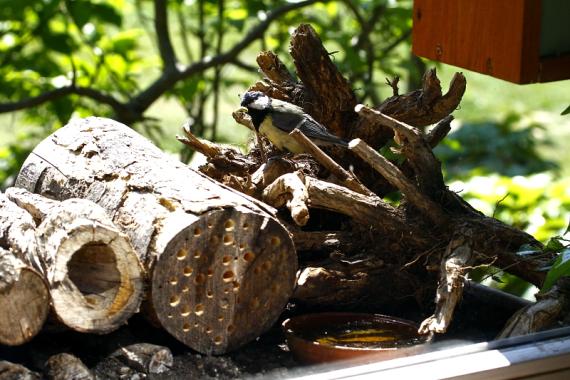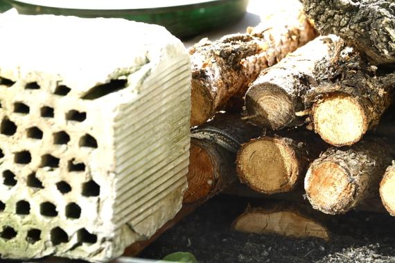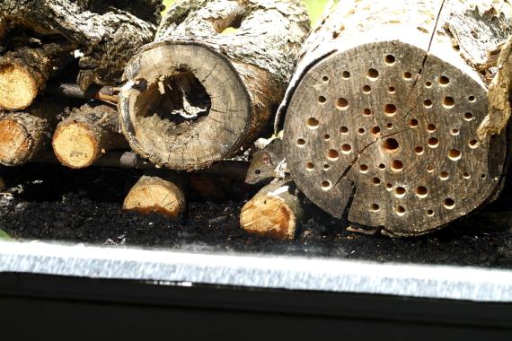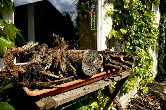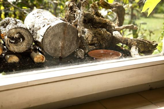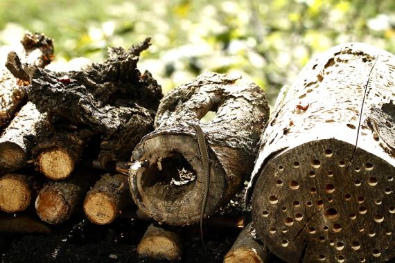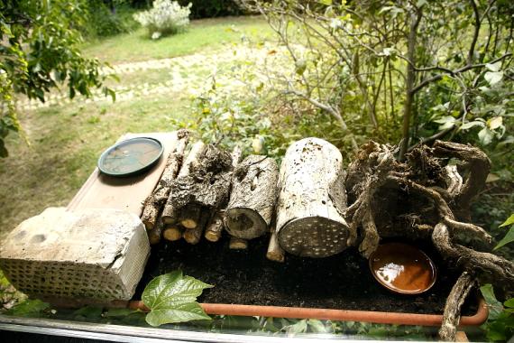 Az ablakgyíkvár farakás-ágai és a vastagabb méhecskehotel- (darázsgarázs-)rönkök