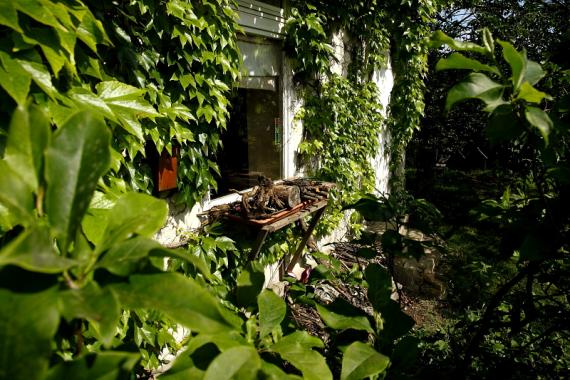 Természetvédelmi farakáshoz kapcsolódó ablakgyíkvár vadszőlővel befuttatott