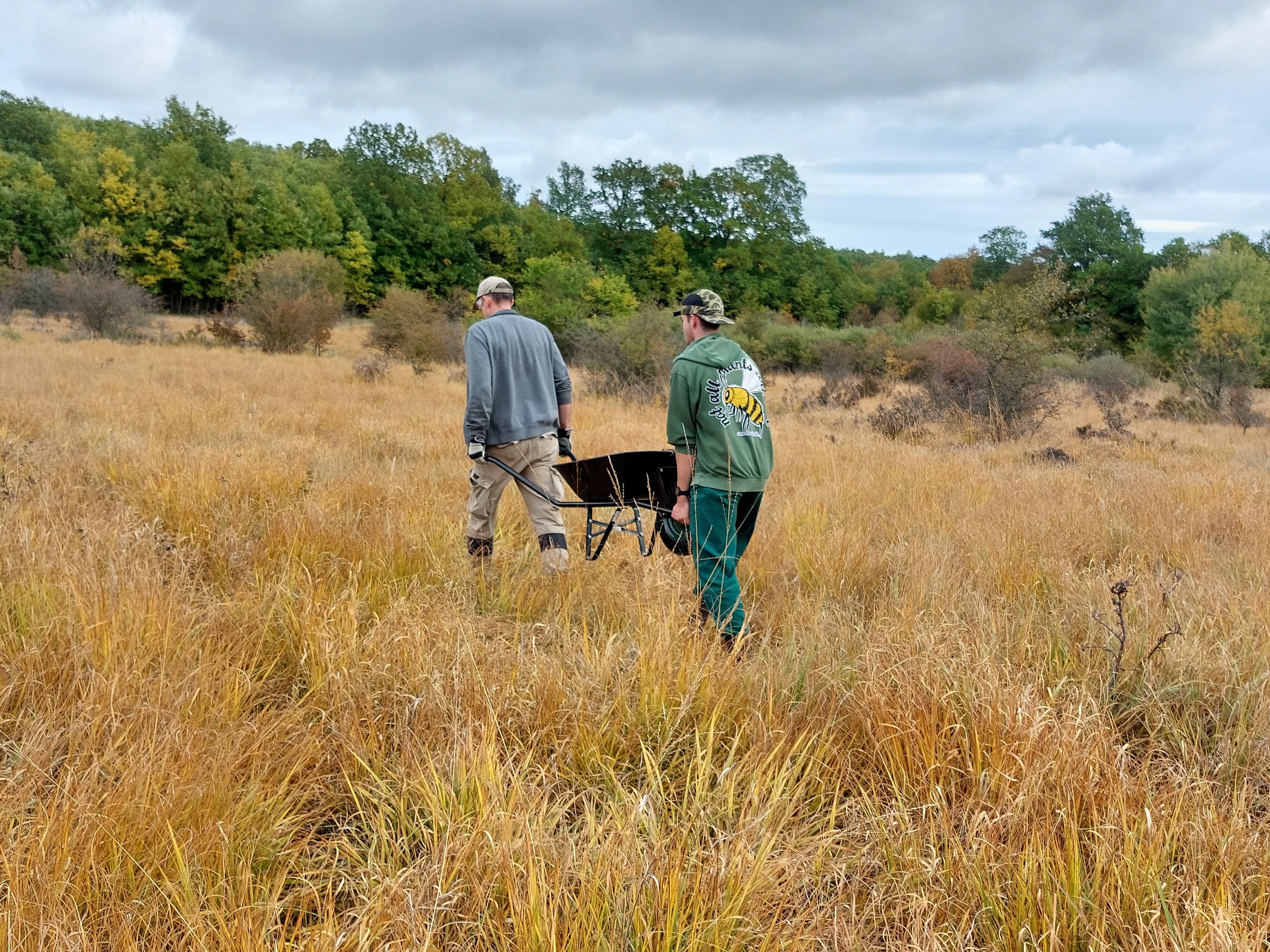 Zajlik a láprét becserjésedése, így ezeket a cserjéket vágtuk és hordtuk le a területről. Illetve, nagy mennyiségű avar, azaz túlzott mennyiségű szerves anyag halmozódik fel a területen, ami kedvez az inváziós fajok megjelenésének és az eredeti -tápanyag szegény környezethez szokott- lápi növényzet számára egyre inkább alkalmatlanná válik az élőhely. Csapatunk ettől az avartól is próbálta megszabadítani a területet, a munkánk eredménye leginkább a hatalmas kazlakkal közlekedő önkéntesek oda-vissza ingázásán, majd az erdő szélére kihordott avarosodott növényzet mennyiségén látszott.