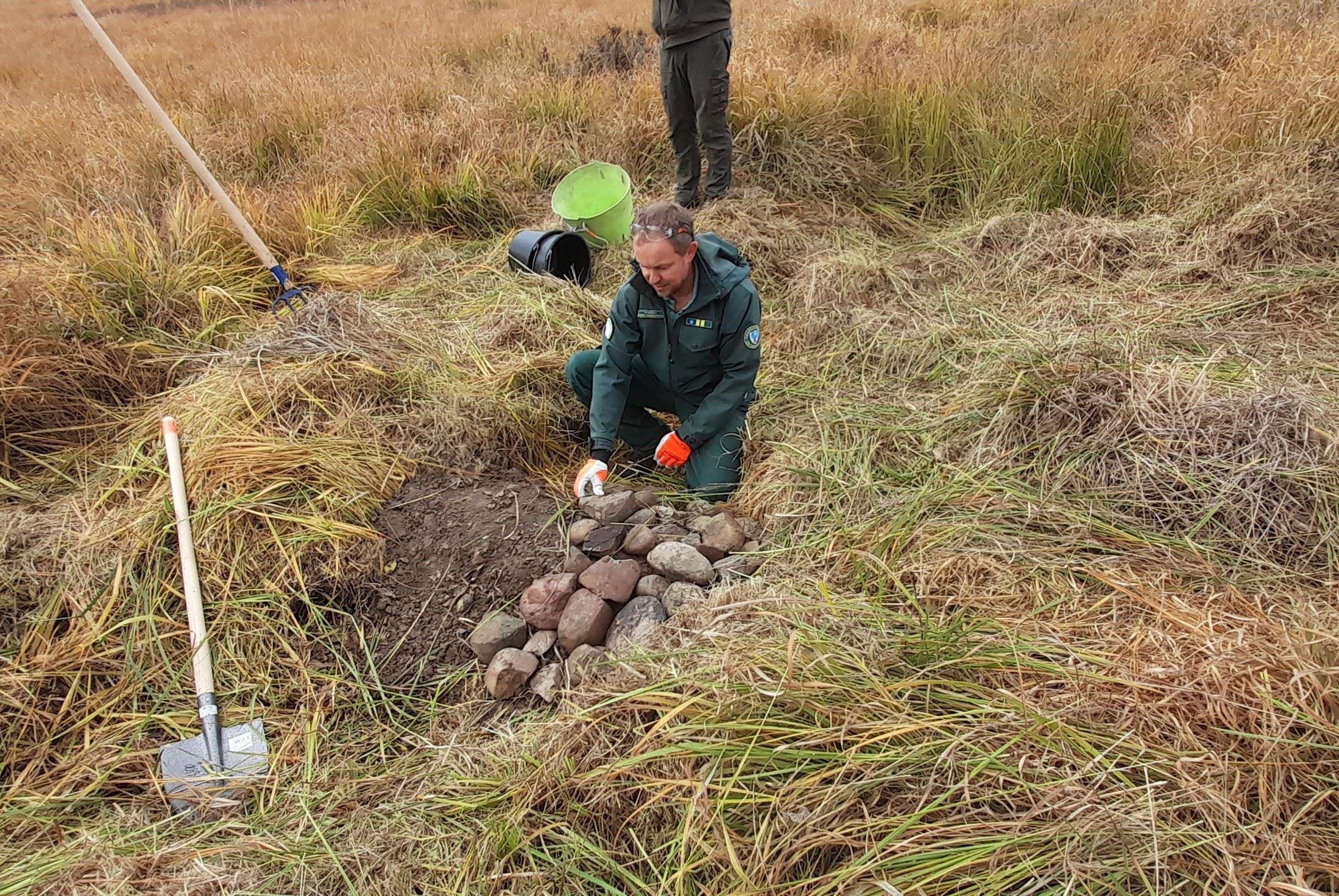 A területen egyrészt az aszályt okozó klímaváltozásnak, másrészt egy korábban húzott vízelvezető ároknak "köszönhetően" egyre kevesebb a víz, így a nap másik csapásvonala a vízvisszatartás elősegítése volt. Ennek szellemében a területet lecsapoló központi árokba föld és kövek keverékével egy mini gátat hoztunk létre, mondhatni, kubikoltunk. Bár a kubikos talicskát leginkább csak űrtartalma miatt vettük igénybe, -a rendeltetésszerű használat ilyen zsombékos élőhelyen lehetetlen volt- de a fiúk legalább a kreatív énjüket is kiélhették.