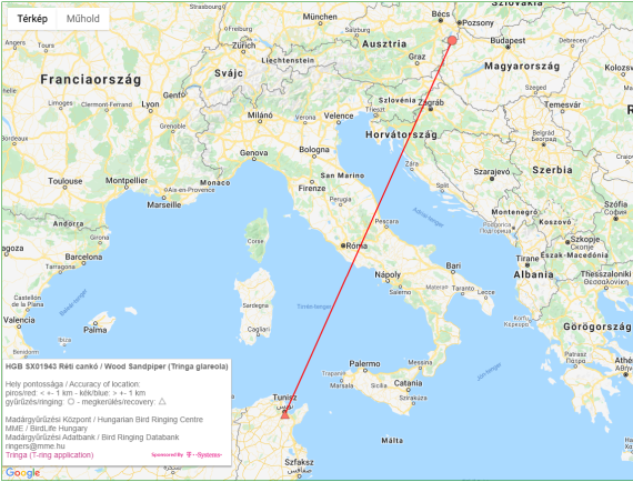 Egy hazai gyűrűs réti cankót figyeltek meg augusztus 6-án egy Tunisz határában elterülő sóstóban (Sebkhet Sejoumi, megfigyelő: Sami Rabah).