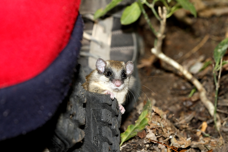| ... a Zorró-maszkos erdei pele. Az éjszaka aktív állatok különösen a túra elején voltak álomittasak, ez az erdei pele is majdnem visszaaludt az alkalmi pihenőhelynek tekintett cipősarkon. |