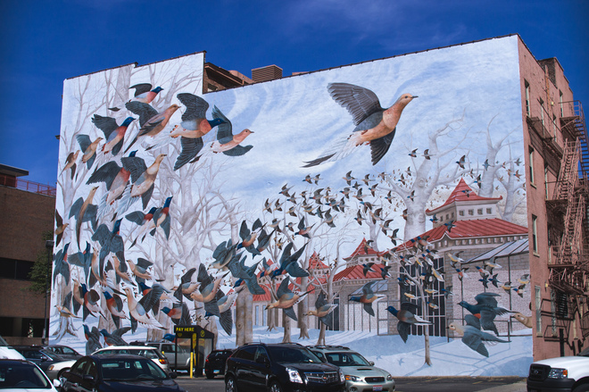 Egy egész falat borító festmény őrzi a vándorgalamb emlékét Cincinatti városában, ahol a faj utolsó példánya élt (Forrás: artworkscincinnati.org).
